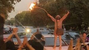 توضیح تصویر،او دختری است که در میان جمع معترضان در ساوه کنار آتش می‌رقصد و در میان تشویق آنها روسری‌اش را در آتش می‌اندازد