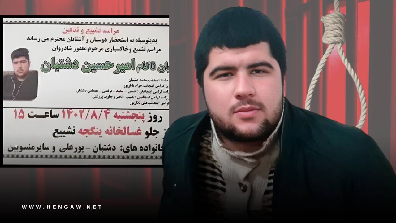 بر اساس گزارش رسیده به سازمان حقوق بشری هه‌نگاو، سحرگاه پنج‌شنبه ۴ آبان ماه ١۴٠٢ (٢۶ اکتبر ٢٠٢٣)، حکم اعدام امیرحسین دشتبان، زندانی ۲۲ ساله و اهل روستای “ینگجه” از توابع آذرشهر در زندان مرکزی تبریز اجرا شد.