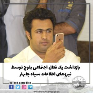 یک فعال اجتماعی بلوچ توسط نیروهای اطلاعات سپاه چابهار بازداشت و به مکان نامعلومی منتقل شد.