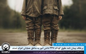خبرگزاری هرانا – برخلاف تعهدات بین المللی ایران تحت عنوان الحاق به پیمان نامه حقوق کودک و بخش عدم به کارگیری کودکان در امور نظامی، ۳۳۷ دانش آموز از مشهد به اردوهای موسوم به “راهیان نور” در مناطق عملیاتی کشور اعزام شدند.