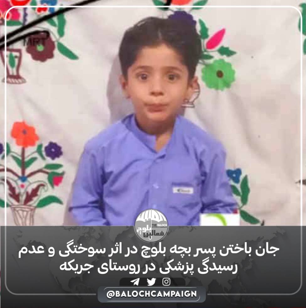 به گزارش کمپین فعالین بلوچ، در تاریخ ۲۷ اسفند ماه ۱۴۰۱، یک پسر بچه بلوچ در روستای جریکه از توابع شهرستان زهک که دچار سوختگی شده بود جان خود را از دست داد.