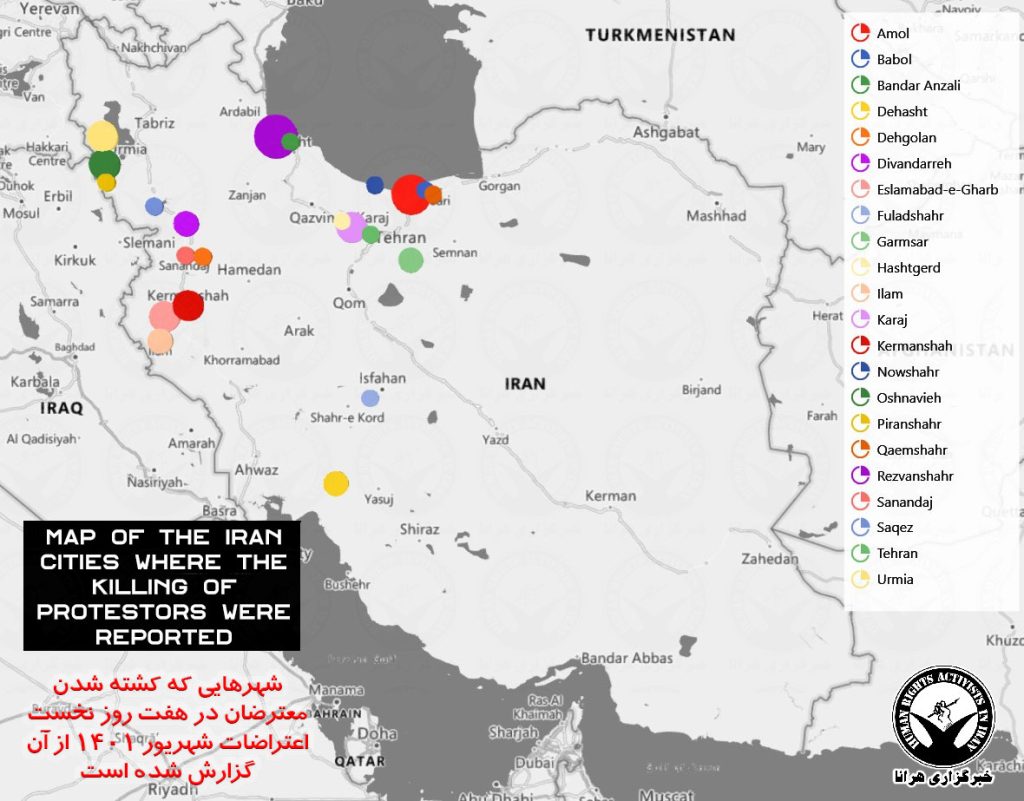 شهرهایی که معترضان در یک هفته اعتراض در خیابانهای آن حاضر شدند به شرح ذیل توسط هرانا راستی آزمایی شده است: