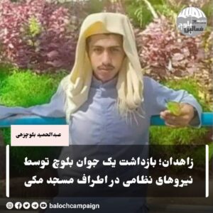 یک جوان بلوچ در اطراف مسجد مکی زاهدان توسط نیروهای نظامی بازداشت و به مکان نامعلومی منتقل شد.