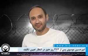 خبرگزاری هرانا – با گذشت ۲۱۲ روز از زمان بازداشت امیرحسین موسوی، وی کماکان به صورت بلاتکلیف در زندان تهران بزرگ نگهداری میشود.