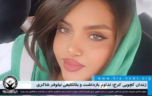 نیلوفر شاکری، شهروند معترض بازداشتی، علیرغم گذشت بیش از ۴ ماه از زمان دستگیری، کماکان در زندان کچویی کرج در بازداشت و بلاتکلیفی بسر میبرد.به گزارش خبرگزاری هرانا، ارگان خبری مجموعه فعالان حقوق بشر در ایران، نیلوفر شاکری، شهروند معترض بازداشتی، کماکان در زندان کچویی کرج در بازداشت و بلاتکلیفی بسر میبرد.مادر خانم شاکری با انتشار مطلبی در صفحه شخصی خود اظهار داشت: “بعد از حدود ۵ ماه که فرزندم در زندان می باشد، همچنان بلاتکلیف مانده ایم، نه حکمی ابلاغ میشود، نه وکیلی میتوانیم بگیریم و نه جوابی به ما میدهند.”