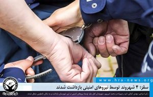 خبرگزاری هرانا – روز دوشنبه ۲۷ مردادماه، زکریا مرادی، مهدی کمالی، امید رحیمزاده و محمد امینپور، شهروندان اهل سقز توسط نیروهای امنیتی در این شهرستان بازداشت و به مکان نامعلومی منتقل شدند.