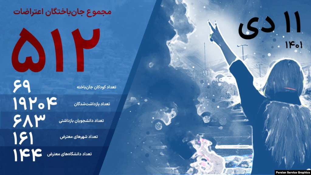 ارگان خبری فعالان حقوق بشری در ایران اعلام کرد از آغاز اعتراضات جاری در ۲۶ شهریور تا روز ۱۱ دی، ۵۱۲ تن بر اثر خشونت نیروهای حکومت جمهوری اسلامی جان خود را از دست دادهاند.