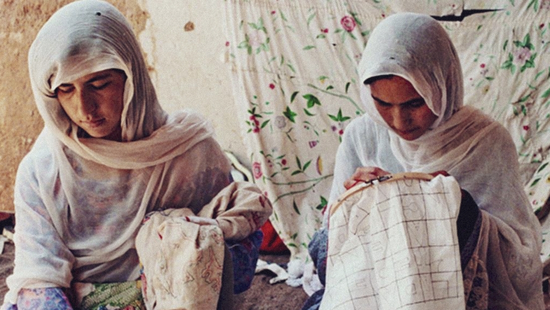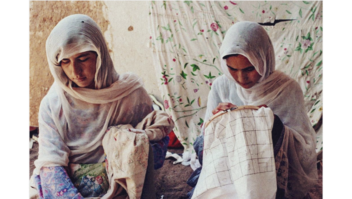 زنان افغانستانی در کمپ مهاجرین در پاکستان در حال گلدوزی برای مجموعه‌ی هنری الجیرو بوئیتی، هنرمند معاصر ایتالیایی، دهه‌ی ۱۹۹۰