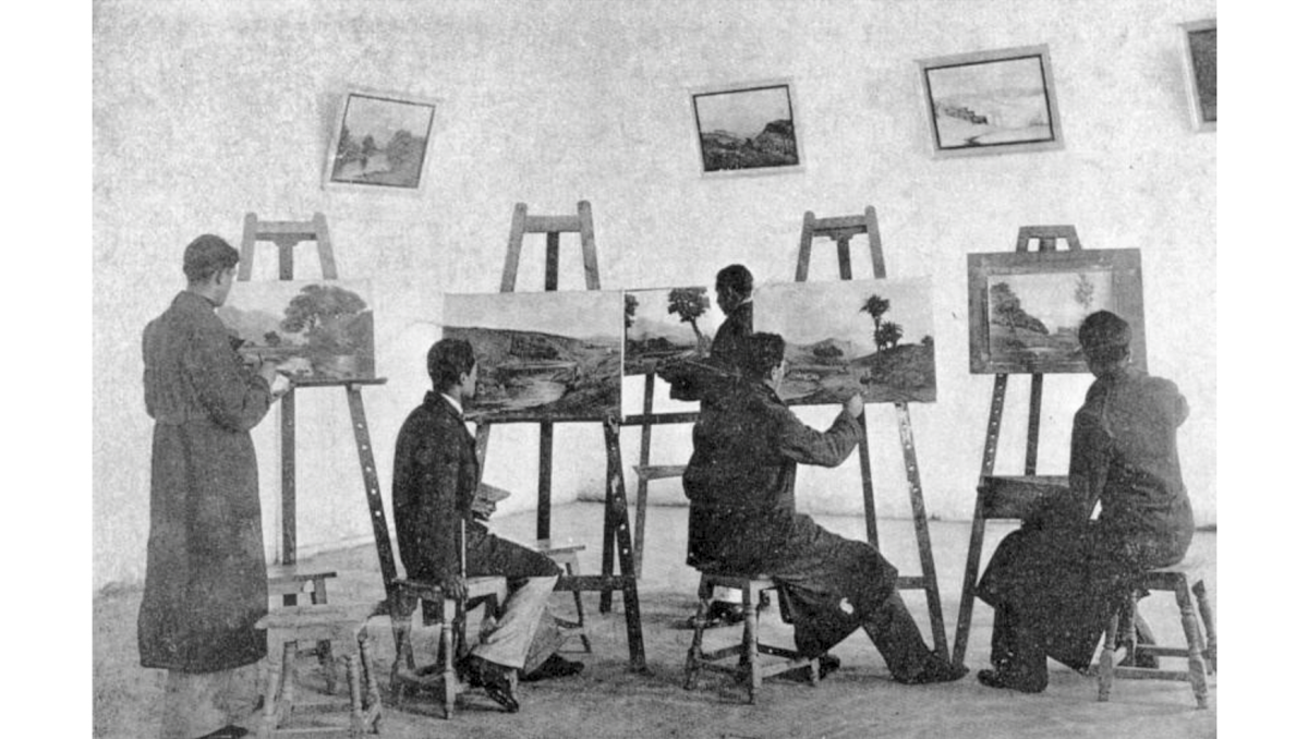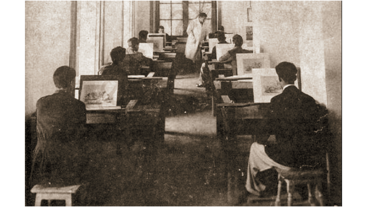 هنرجویان مرد مشغول آموزش نقاشی در کلاس نقاشی مدرسه صنایع نفیسه کابل، احتمالاً دهه‌ی ۱۳۵۰