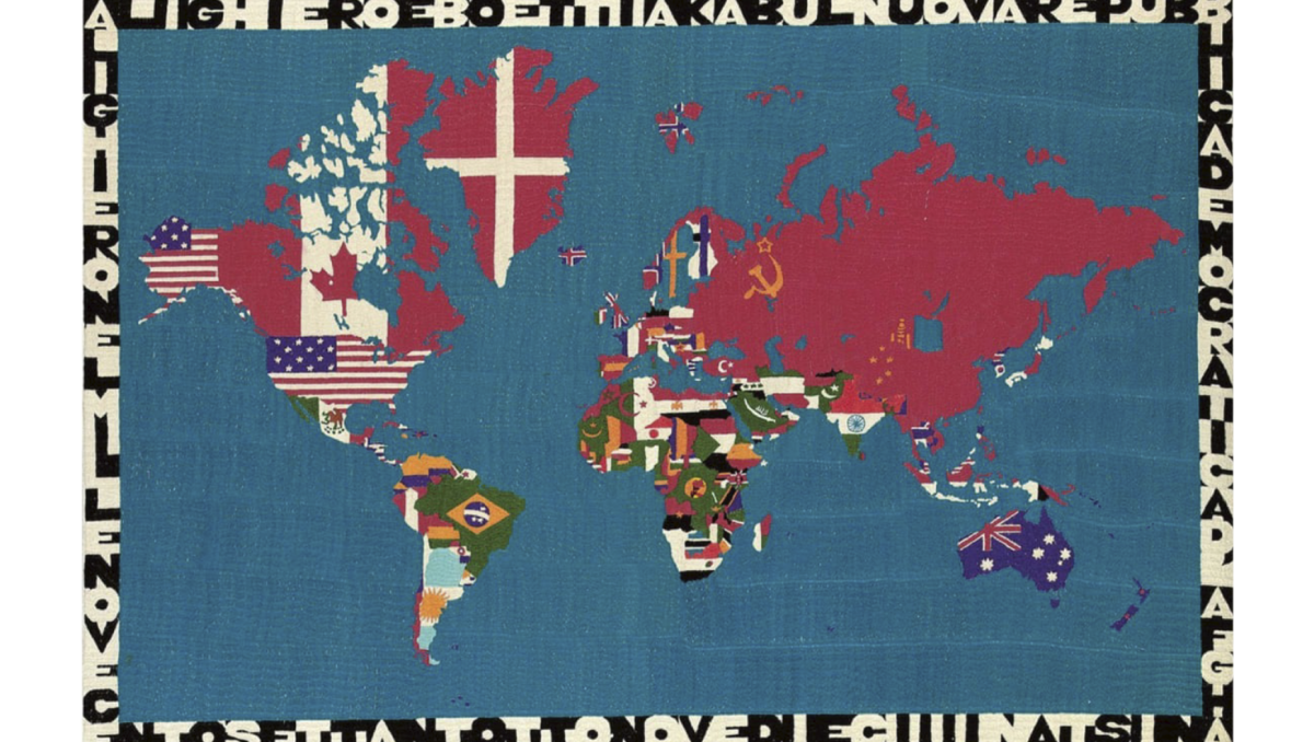 اثر نقشه از مجموعه نقشه الجیرو بوئیتی، آثار این مجموعه عمدتاً در دهه‌ی ۷۰ و ۹۰ در افغانستان و در کمپ‌های مهاجرین پاکستان توسط زنان قالی‌باف و گلدوز افغانستانی انجام شد.