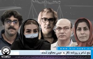 به گزارش خبرگزاری هرانا، ارگان خبری مجموعه فعالان حقوق بشر در ایران، پنج شاعر و روزنامه نگار به حبس محکوم شدند. بر اساس حکمی که توسط شعبه اول دادگاه انقلاب آبادان صادر شده، ماندانا صادقی و آرش قلعه گلاب هر کدام به چهار سال و یک ماه و ۱۷ روز حبس و کوروش کرم پور به دو سال حبس محکوم شده اند. همچنین رضا محمدی و فرزانه یحییآبادی نیز هر یک به سه ماه و یک روز حبس محکوم شدند.