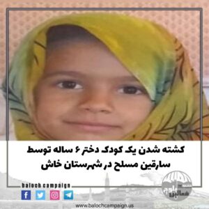 به گزارش کمپین فعالین بلوچ، شامگاه ۲۴ شهریور ماه ١۴٠١، با تیراندازی سارقان مسلح در شهرستان خاش، یک کودک ۶ ساله کشته شد.