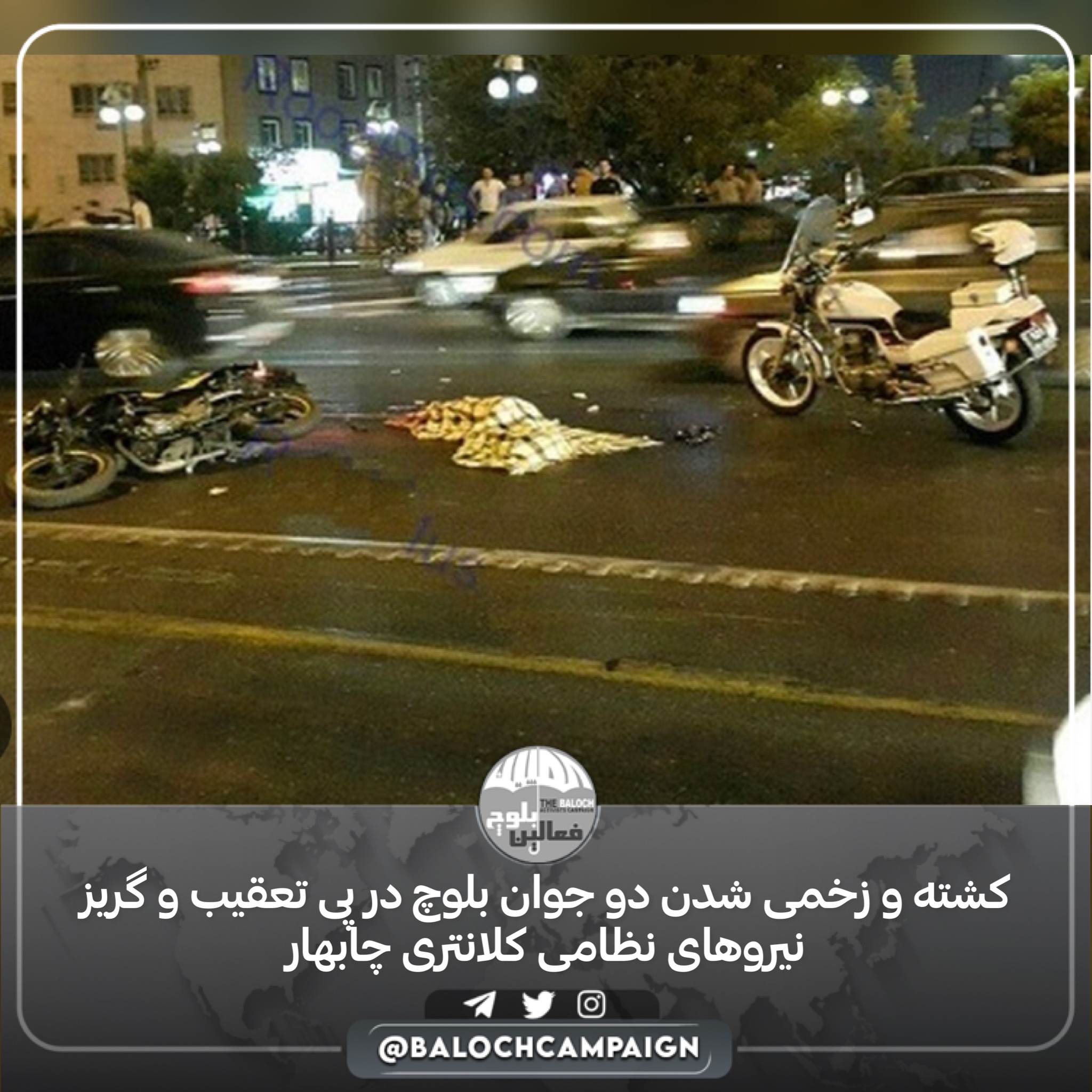شب جاری ۱۷ فروردین ماه ۱۴۰۲، دو جوان بلوچ با تعقیب و گریز نیروهای کلانتری شهرستان چابهار کشته و زخمی شدند.