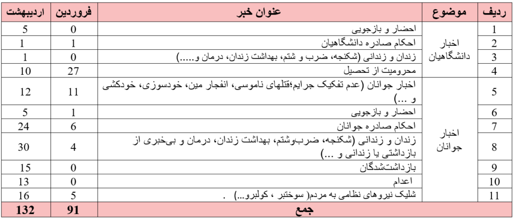 این گزارشات آماری از میان بیش از ۱۳۲ خبر که در طول ماه اردیبهشت ۱۴۰۲ تهیه شده است.