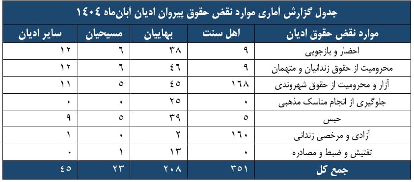 گزارش آماری نقض حقوق پیروان ادیان، آبانماه 1404