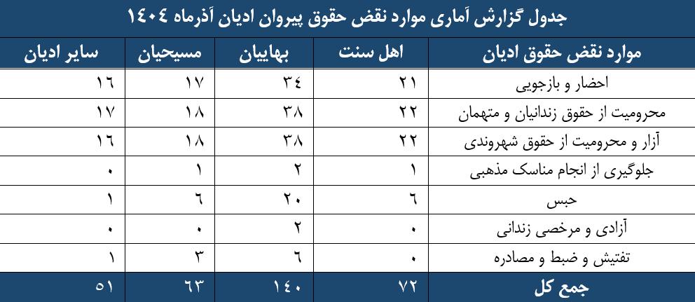 گزارش آماری نقض حقوق پیروان ادیان، آذرماه 1404