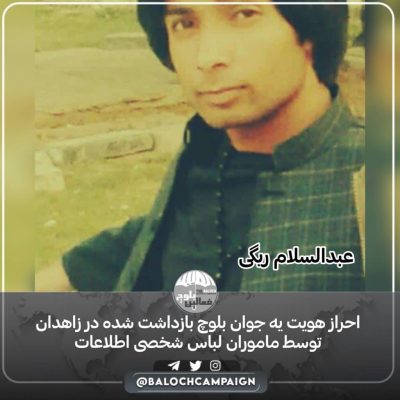 کمپین فعالین بلوچ ۲۴/۰۳/۱۴۰۲ هویت یک جوان بلوچ بازداشت شده توسط ماموران لباس شخصی اطلاعات در زاهدان احراز شد. به گزارش کمپین فعالین بلوچ، روز جمعه ۱۹ خرداد ماه ۱۴۰۲، یک جوان بلوچ به نام «عبدالسلام ریگی» که توسط ماموران لباس شخصی اطلاعات در زاهدان بازداشت شده است احراز شد. عبدالسلام مجرد فرزند علی و …