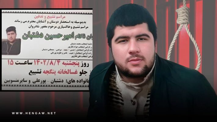 حکم اعدام یک زندانی ۲۲ ساله به نام امیرحسین دشتبان که حین ارتکاب جرم ۱۸ سال و ۶ ماه سال سن داشته است، در زندان مرکزی شهر تبریز به اجرا درآمد. بر اساس گزارش رسیده به سازمان حقوق بشری ههنگاو، سحرگاه پنجشنبه ۴ آبان ماه ١۴٠٢ (٢۶ اکتبر ٢٠٢٣)، حکم اعدام امیرحسین دشتبان، زندانی ۲۲ …