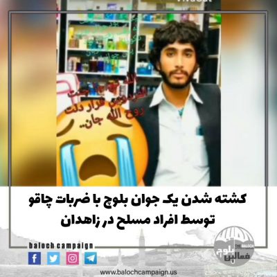ک کمپین فعالین بلوچ ۱۹/۱۰/۱۴۰۱ یک جوان بلوچ در شهر زاهدان توسط افراد مسلح با ضربات متعدد چاقو جان خود را از دست داد. به گزارش کمپین فعالین بلوچ، روز گذشته ۱۹ دی ماه ۱۴۰۱، یک جوان بلوچ توسط افراد مسلح با ضربات متعدد چاقو کشته شد. هویت این جوان بلوچ “روح الله بیلرانی” اهل …