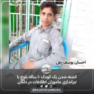 1402.05.29 کمپین فعالین بلوچ یک کودک ۱۰ ساله بلوچ با تیراندازی ماموران اطلاعات دلگان کشته شد. به گزارش کمپین فعالین بلوچ، شامگاه ۲۹ مرداد ماه ۱۴۰۲، یک کودک ۱۰ ساله بلوچ در شهرستان دلگان به ضرب گلوله ماموران اطلاعات کشته شد. هویت این کودک بلوچ «احسان یوسف زهی» ۱۰ ساله فرزند مراد اهل و ساکنروستای …