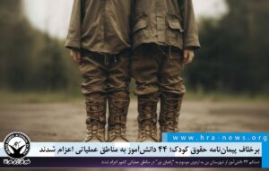 ۱۴۰۴/۰۷/۰۶ هرانا برخلاف تعهدات بینالمللی ایران تحت عنوان الحاق به پیماننامه حقوق کودک و تعهدات مربوط به عدم بهکارگیری کودکان در امور نظامی، ۴۴ دانشآموز از شهرستان بن به اردوی موسوم به “راهیان نور” در مناطق عملیاتی کشور اعزام شدند. به گزارش خبرگزاری هرانا به نقل از صداوسیما، فرمانده سپاه ناحیه شهرستان بن از آغاز …