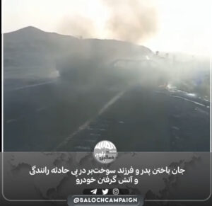 19.03.1402 کمپین فعالین بلوچ هشدار ویدیو دارای صحنه های دردناک میباشد. کمپین فعالین بلوچ/ صبح روز گذشته ۱۹ خرداد ماه ۱۴۰۲، یک پدر و پسر سوختبر در پی حادثه رانندگی و آتش گرفتن خودرو جان خود را از دست دادند. گفته میشود، این حادثه در محور خاش به سراوان اتفاق افتاده است و پدر و …