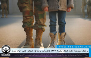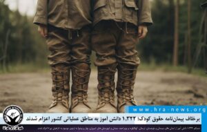 هرانا ۱۴۰۴/۰۹/۱۹ برخلاف تعهدات بین المللی ایران تحت عنوان الحاق به پیماننامه حقوق کودک و تعهدات مربوط به عدم به کارگیری کودکان در امور نظامی، دستکم ۱,۳۲۲ دانش آموز از استان های سیستان و بلوچستان، لرستان، کهگیلویه و بویراحمد، سمنان و شهرستان های شیروان، بهار و پیشوا به اردوی موسوم به «راهیان نور» اعزام شدند. …