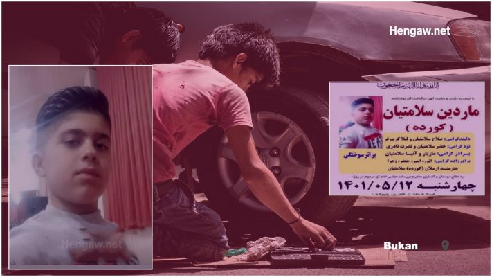 15:29 – 11 مرداد 1401 یک کودک کار ۱۰ ساله اهل بوکان با هویت ماردین سلامتیان که هفته گذشته در محل کار و در اثر آتشسوزی دچار سوختگی شدید شده بود، روز دوشنبه ۱۰ مرداد ۱۴۰۱ (۱ آگوست ۲۰۲۲) در اثر شدت جراحات در یکی از مراکز درمانی ارومیه جانباخت. بر اساس گزارش رسیده به …